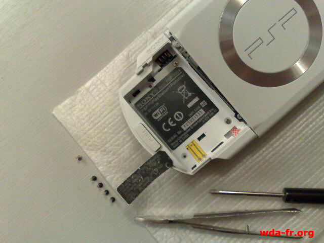La dernière des 4 vis noires (arrière bas gauche, sous la batterie) est recouverte d'une bande de garantie noire. Une fois celle-ci décollée, même très méticuleusement,elle sera à jamais marquée comme retirée (indications "VOID"), et la garantie SONY du produit sera alors caduque. La WDA ne peut dès lors être tenue comme responsable.