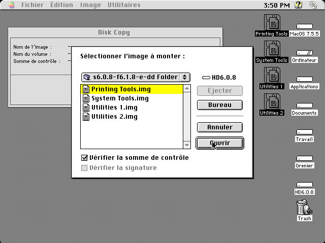 1) faire monter les images disques d'installation du système sur le bureau (avec DiskCopy version 6.x)