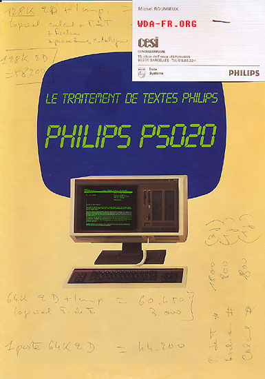 Aujourd'hui, petit scan d'une brochure commerciale de la marque PHILIPS, pour son ordinateur à traitement de textes P5020, publiée certainement en 1982 :
