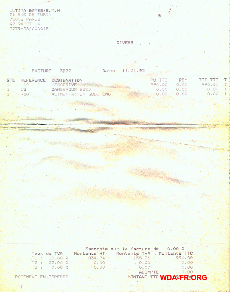 Facture de 1992 pour un package MegaDrive + 1 jeu