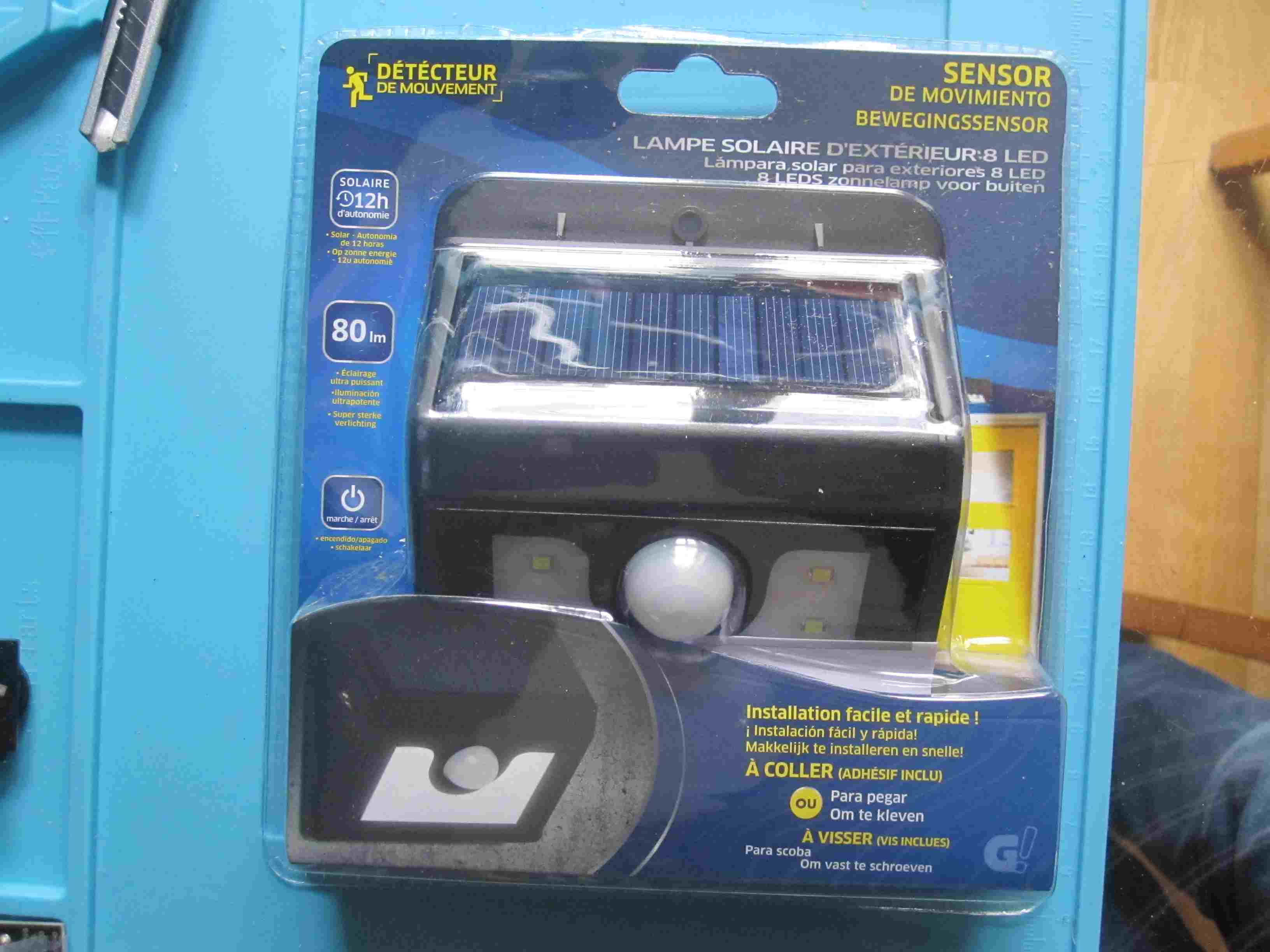 une petite lampe solaire à LED comportant un détecteur de mouvement et marchant sur batterie. Elle est prévue pour un fonctionnement extérieur mais il vaut mieux l'enrober d'un film plastique alimentaire car elle est très loin d'être étanche