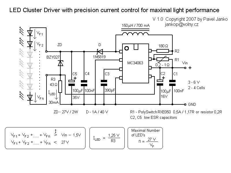 — Une fois, dans “mes” bacs de recyclage favoris, je tombe sur 2 lampes LEDs grillées… Je les démonte et récupère les platines de LEDs CMS. Mais une des LEDs CMS était grillée (petit point noir). Ayant entretemps récupéré une platine de LEDs de lampe de poche à piles, je remplace la LED grillée par celle de la lampe de poche : — Mais, comme vous le voyez, les LEDs de la platine sont par 3 en série et la LED de la lampe de poche est unique ! Qu'importe, je teste (avec un circuit testeur de Zéners montant à ~135V, fabriqué à partir du 34063 !), une fois la LED de lampe de poche soudée en place, et toutes les LEDs s'allument avec une intensité lumineuse équivalente ! Il me restait aussi à me fabriquer un circuit capable d'alimenter la série de LEDs qui a une tension de fonctionnement de 40V !