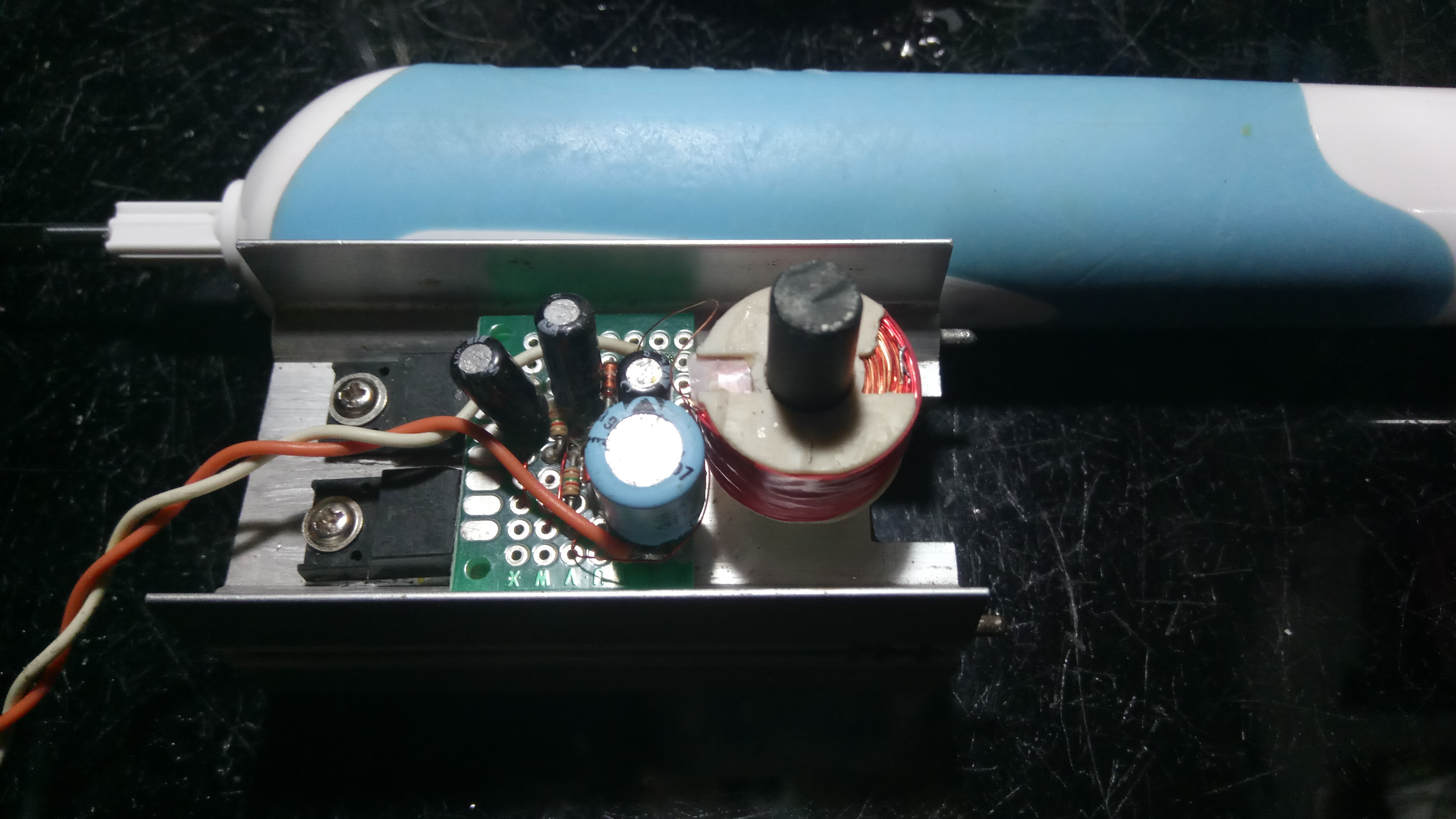 — Dans les bacs de recyclage, je trouve parfois des brosses à dents électriques “Oral B” qui, parfois, fonctionnent encore ! En ayant récupéré une, je me mets en tête de réaliser un chargeur pour ladite brosse… Oh ! Pas le chargeur 230V d'origine, indémontable et souvent en panne, mais une “astuce” à partir d'une alimentation 12V de box Internet, par exemple…