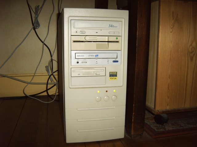 C'est un Pentium 200 (pas encore MMX et monté par un assembleur), 48 Mo de mémoire RAM, équipé d'une carte Guillemot Phoenix 3Dfx2 16Mo sur port PCI et d'une carte audio Soundblaster 64. Cette machine est toujours en parfait état de fonctionnement et me sert essentiellement à réaliser les scans de boîtes de jeux vidéo faisant l'objet d'articles sur mon site. Deux OS se disputent son utilisation: Windows 98 et DOS 6.22 via une disquette de boot. Cette machine est équipée d'un lecteur CD-ROM, d'un graveur et de deux lecteurs de disquettes 5"1/4 et 3,5"). J'ai de nombreuses disquettes en stock dont plusieurs boîtes toujours inviolées. Toutes mes machines de bureau (jusqu'à la dernière en date) possèdent un lecteur de disquette 3,5".