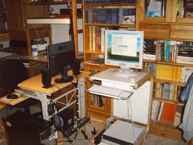 A droite et en beige clair, un Pentium 4 de dernière génération (Siemens-Fujitsu) reliquat d'une mise à niveau d'entreprise et cédé à vil prix (valeur résiduelle en fin de leasing) à ses anciens utilisateurs (le personnel). Sur ces deux machines réside Windows XP (home à gauche et pro à droite). La machine de droite est une entrée toute récente et n'a pas encore d'utilité. Celle de gauche sert également comme serveur lors de parties en LAN (uniquement) organisées avec des connaissances, sur différents jeux (Never Winter Nights, Dungeon Siege, Dungeon Lords, Unreal, Heretic 2, Unreal Tournament, Battlefield 1942, Vietnam et d'autres jeux proposant du coopératif, essentiellement…). Pas de jeux actuels, ce dont personne ne se plaint, puisque les clients de mon réseau filaire (le wifi n'entrera pas chez moi) sont des machines d'anciennes générations.