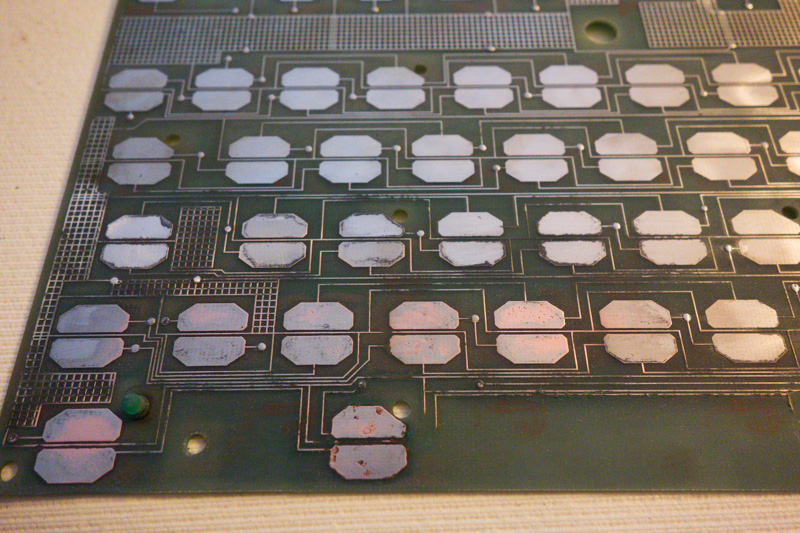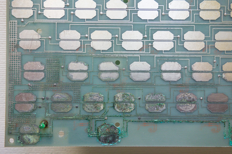 Comme vous pouvez le voir, il y a de la corrosion qui a mangé des pistes : Pour les 'pastilles' des touches, je pense utiliser du cuivre autocollant, si j'en trouve.