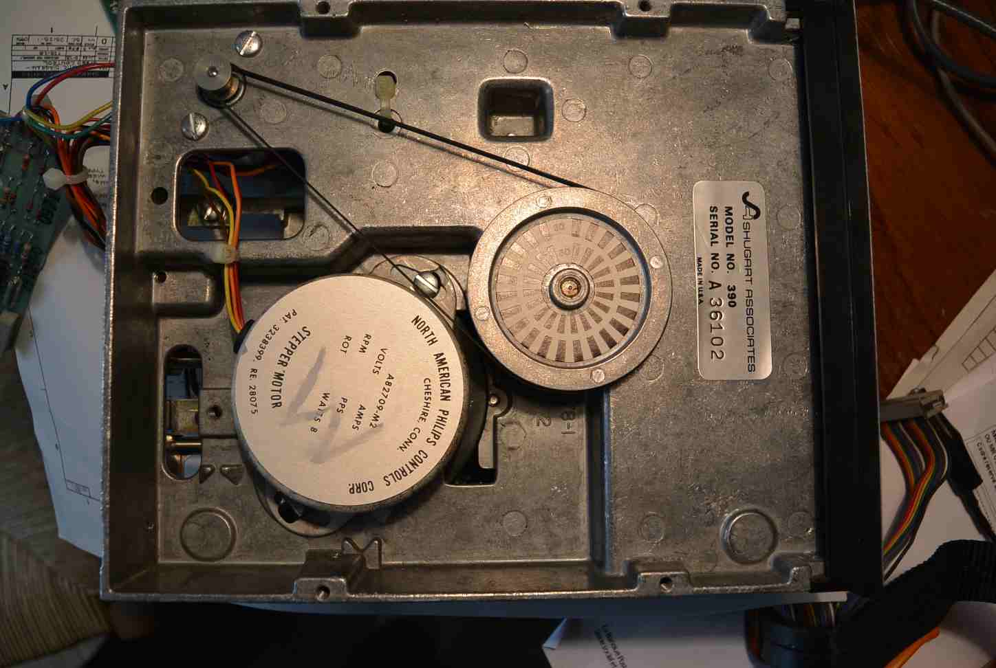 j'ai commencé a attaquer le floppy, il s'agit d'un Shugart SA 390 fabriqué aux USA, il est reconnaissable à sa spirale "escargot" noire, sa carte analogique qui ne comporte qu'un seul réglage, ses 2 selfs apparentes sur un barreau de ferrite, sa nappe de connexion multicolore non blindée...