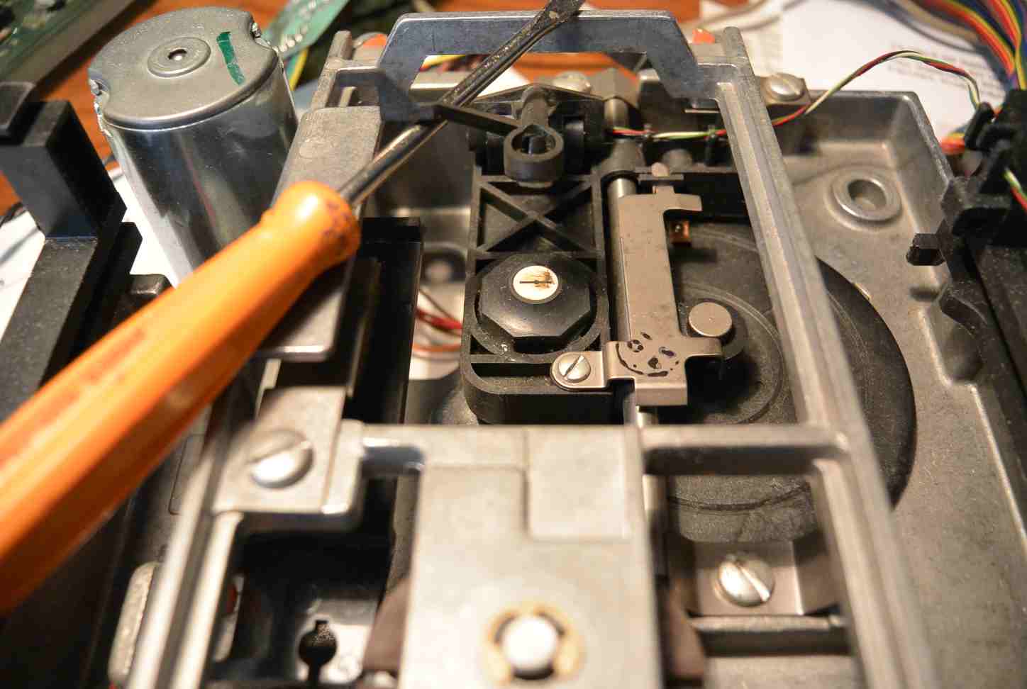 Tête et glissières toutes propres. A coté de la tête on voit la vis qu'il ne faut jamais toucher sous peine de réalignement complet du floppy !