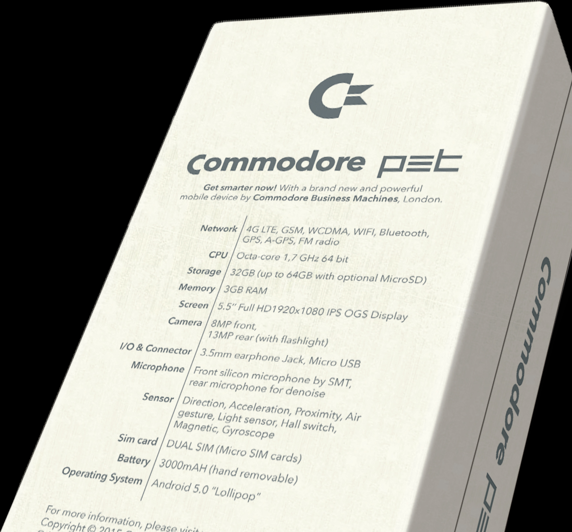 Cette société Commodore Business Machines est basée à Londres, contrairement à la société d'origine du même nom qui était américaine. Elle utilise le même logo, mais n'a probablement rien d'autre en commun. Son CEO est Massimo Canigiani, un Italien. La société annonce le lancement prochain du PET. Cet hommage au PET 2001, un ordinateur lancé en 1977 pour contrer le premier ordinateur d'Apple, sera cette fois un smartphone sous Android 5.0, histoire de contrer l'iPhone.