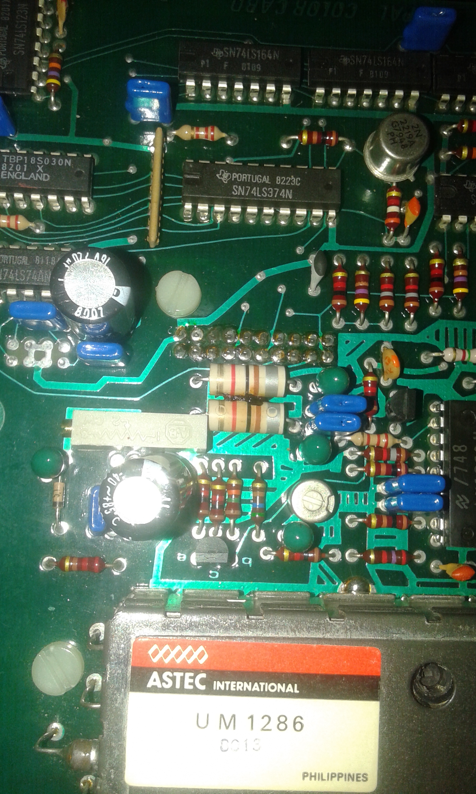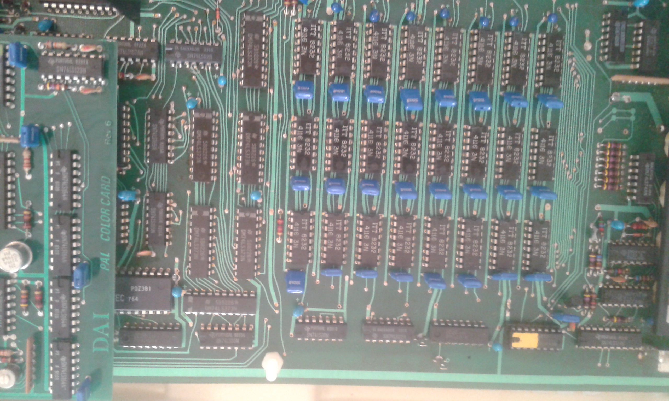 Pour ce qui est de la carte vidéo, c'est une PAL COLORCARD rev 6. Dans le DAI que j'avais acheté en 1980, la carte vidéo avait deux sorties: VHF et RGB. Celle-ci n'a que la VHF canal 04. Le modulateur est un ASTEC UM1286.