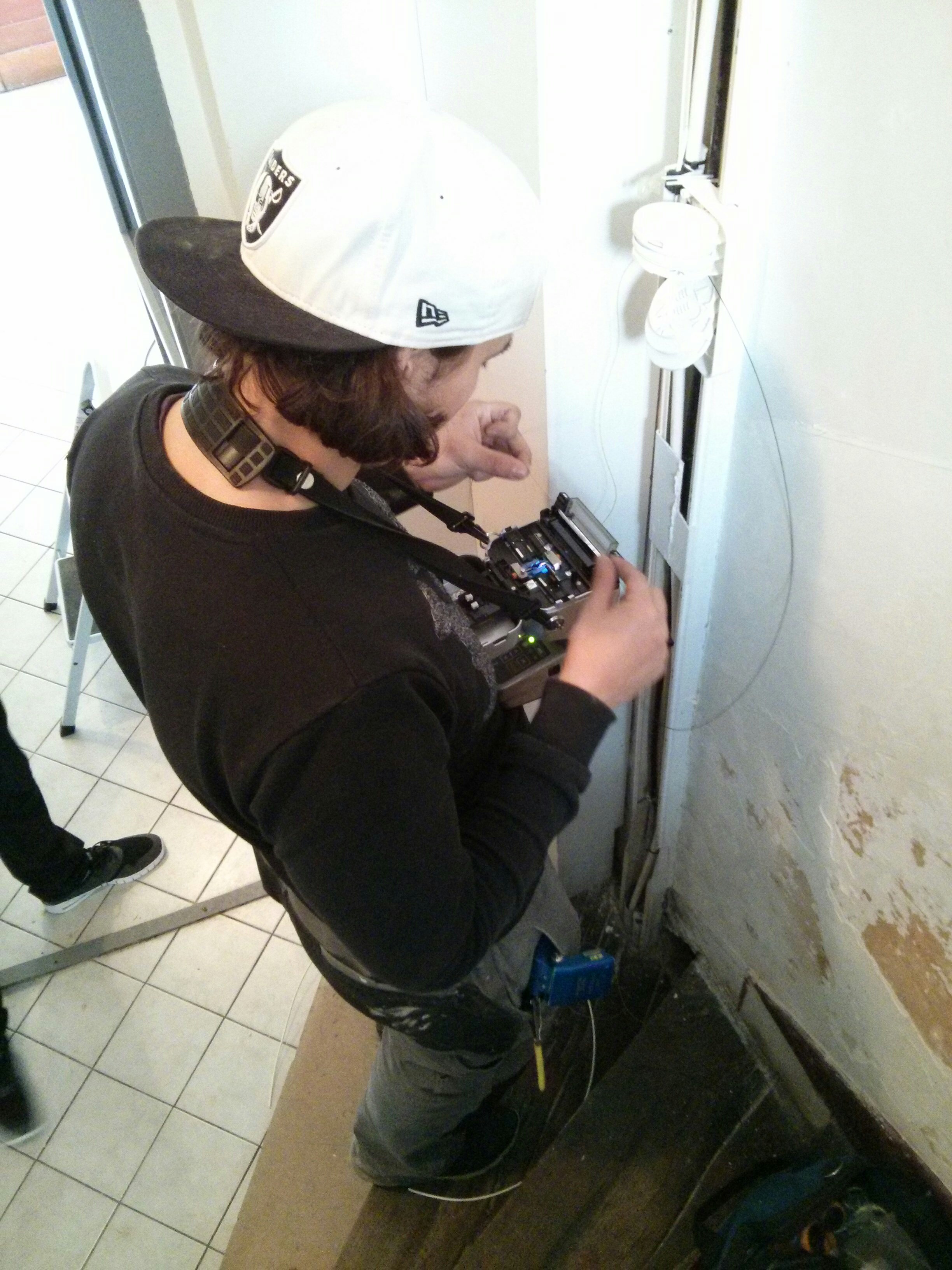 Le technicien a passé tout le reste du temps (environ 45 mn) à faire cheminer proprement la fibre jusqu'au boitier posé par Orange 1 étage au dessus mais surtout a repérer la bonne fibre puis la souder sur le câble.