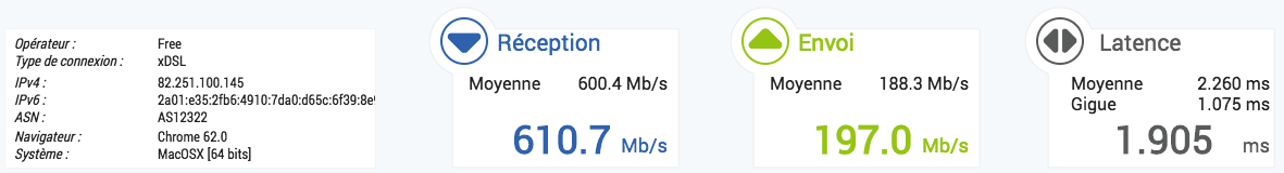 Un peu plus d'un an est passé, et après avoir annoncé le 04/12/2018, lors de la keynote Free, que l'upload fibre des anciennes Freebox Révolution et Mini 4K allait être doublé le 11/12/2018, voici mes stats actuelles, toujours sur la même installation :