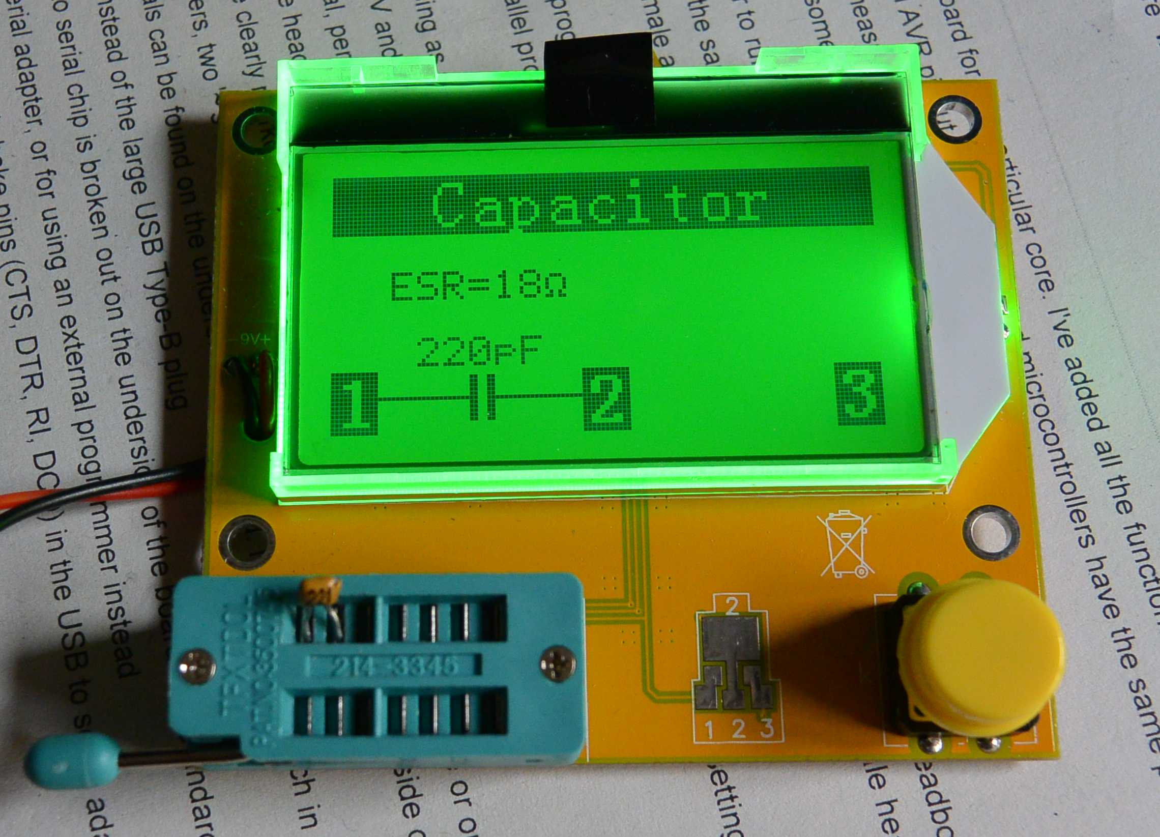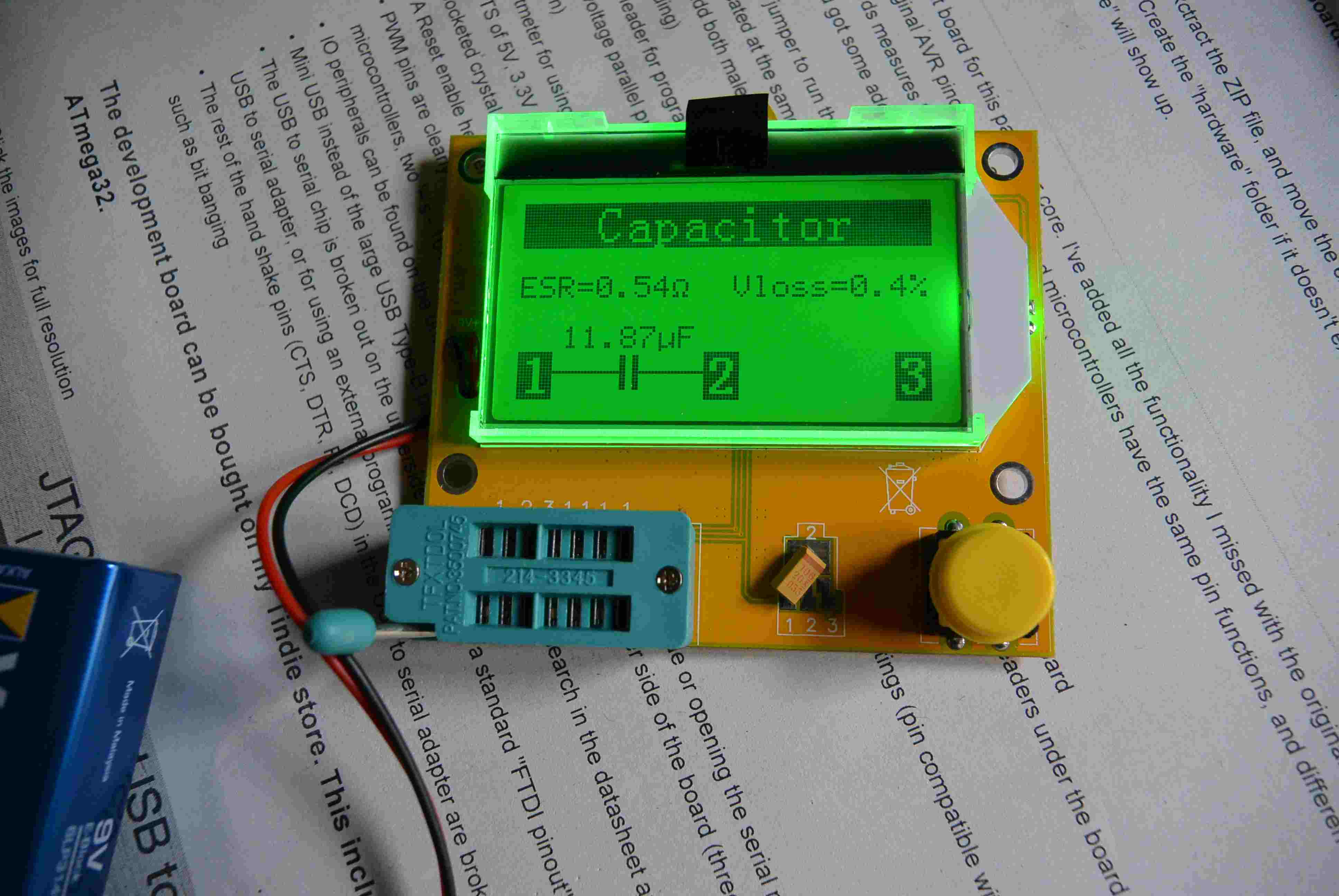 Il est super simple à utiliser, on monte le composant dans le support à insertion nul, on appuie sur le bouton, il commence par mesurer la tension de la pile puis effectue la mesure en 2 à 3 secondes et affiche le résultat. Pour les gros condensateurs de plusieurs milliers de µF la mesure peut prendre une dizaine de secondes. Celle ci reste affichée une dizaine de seconde puis l'appareil s'éteint automatiquement.