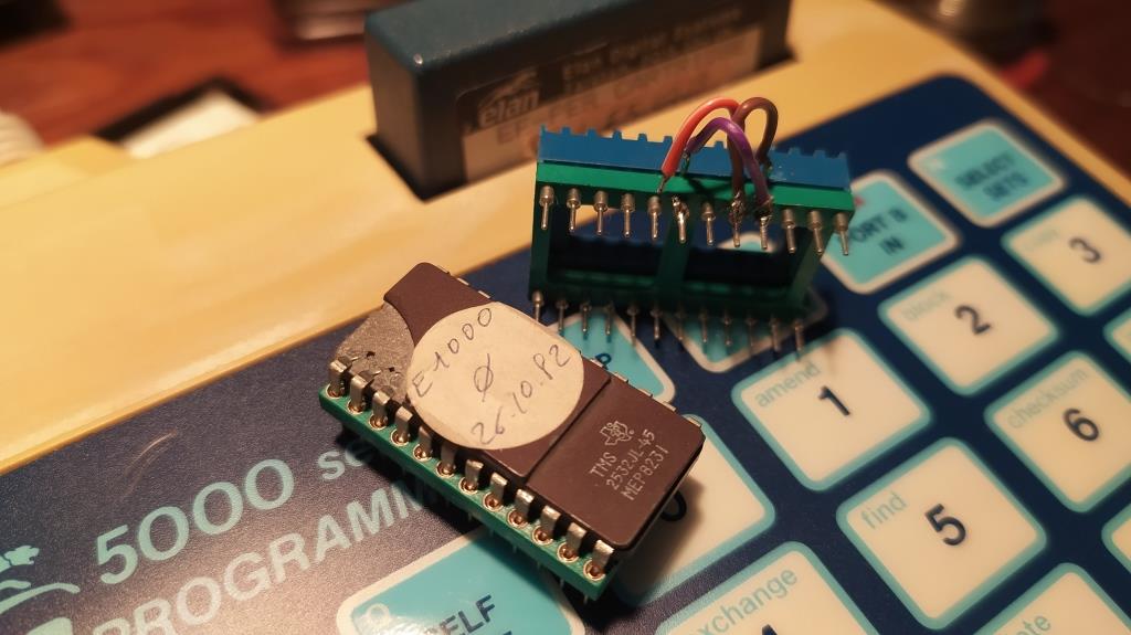 Pin 20 (CS) ---------------->Pin 18 (CS) Sur la photo on voit que l'Eprom 0 a pris cher, céramique cassée, pattes tordues mais finalement elle fonctionne bien, ouf ! . J'ai dû la mettre sur un support intermédiaire car les pattes n'auraient pas supporté un enfichage et désenfichage. Sur l'adaptateur, le strap vers le CS est déconnecté, c'est normal, c'était juste pour un petit test.