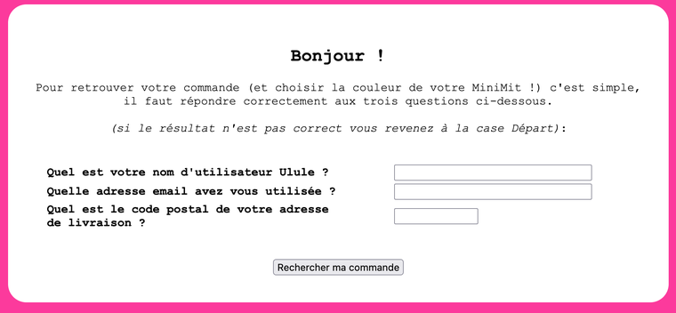 Une fois sur cette page, il vous faut répondre de façon exacte aux trois questions pour avoir accès à votre commande.