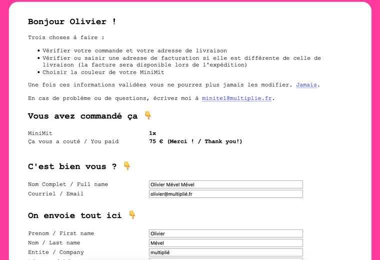 Pour ceux qui n'ont pas encore sélectionné la couleur et validé leur adresse d'expédition, c'est le moment de le faire. Je vous laisse encore quelques jours et ensuite j'expédierai un Minitel rose à l'adresse que j'ai en rayon.
