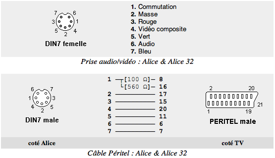 La réalisation du câble péritel de l'Alice 90 exige d'acquérir un câble du commerce de bonne qualité et respectant les normes de fabrication attendues, à savoir que les liaisons des broches 7, 11, 15, 19 & 20 doivent être réalisées avec du câble coaxial de faible diamètre (~3mm maxi) et d'impédance égale à 75 ohms. Pour la broche 6, normalement il faut un câble blindé basse fréquence. Les prises SCART utilisées doivent, évidement, être démontables.