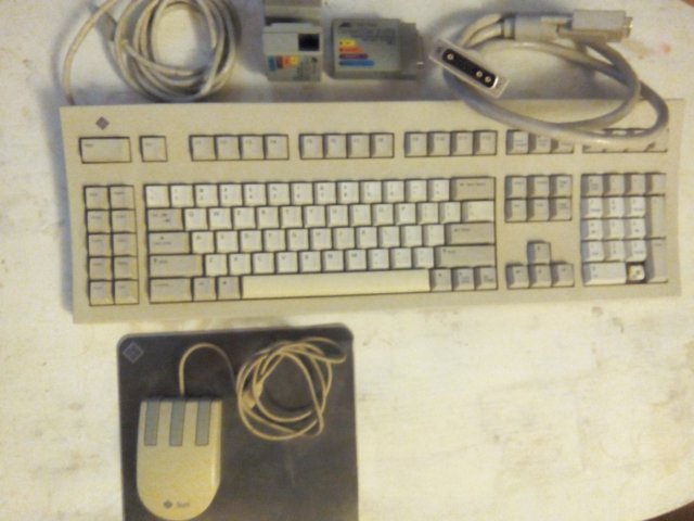 les deux boitiers gris au dessus du clavier sont des transceivers pour l'ethernet.. il n'y a as d'RJ45 sur les sparcs mais un gros DB 15, ces transceivers font l'interface.