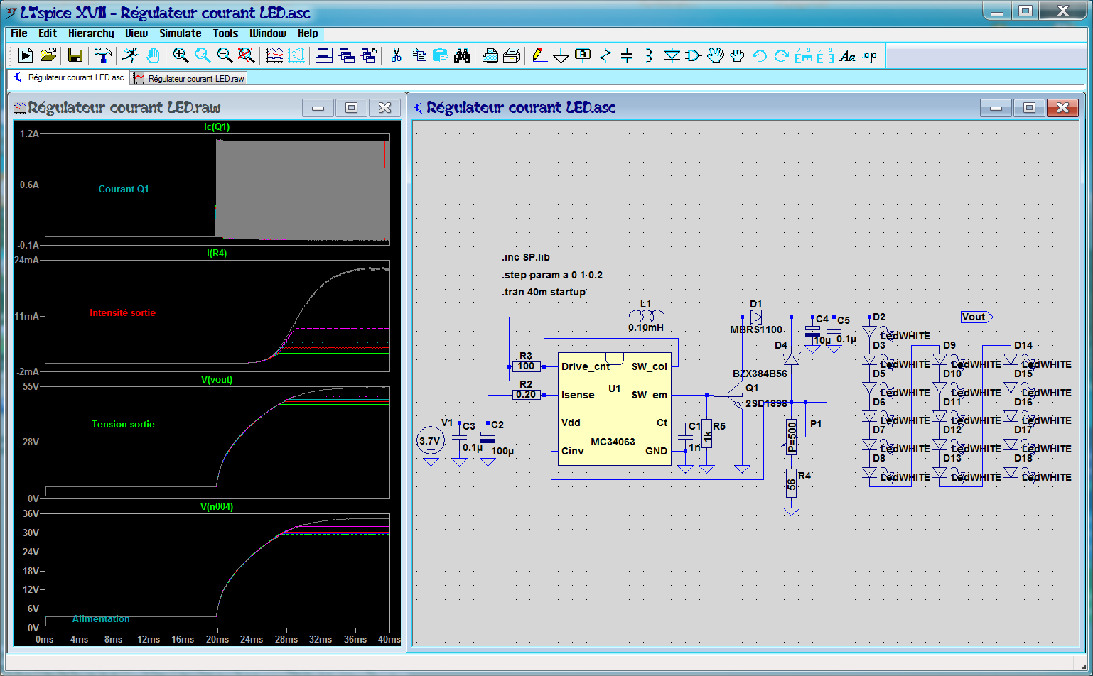 — Je me tourne alors vers une “vieille connaissance” : le circuit intégré 34063, qui est capable de beaucoup de choses, notamment de piloter une série de LEDs sur une tension aussi basse que 3,7V, soit une batterie 18650 de récup' de batteries d'ordinateurs portables ! Mais d'abord une simu sur l'excellent logiciel “LTSpice” : , puis, avisant une platine de chargeur de téléphone portable pour automobile (avec prise allume-cigares) qui “arborait” ce genre de circuit intégré, je la modifiai pour répondre à ce cahier des charges, à partir de ce schéma : — Voici donc la “lampette” en fonctionnement : — Depuis, comme je me lève la nuit au moins une fois pour mes “petits besoins”, je n'allume pas la lumière et ne dérange pas ma femme !