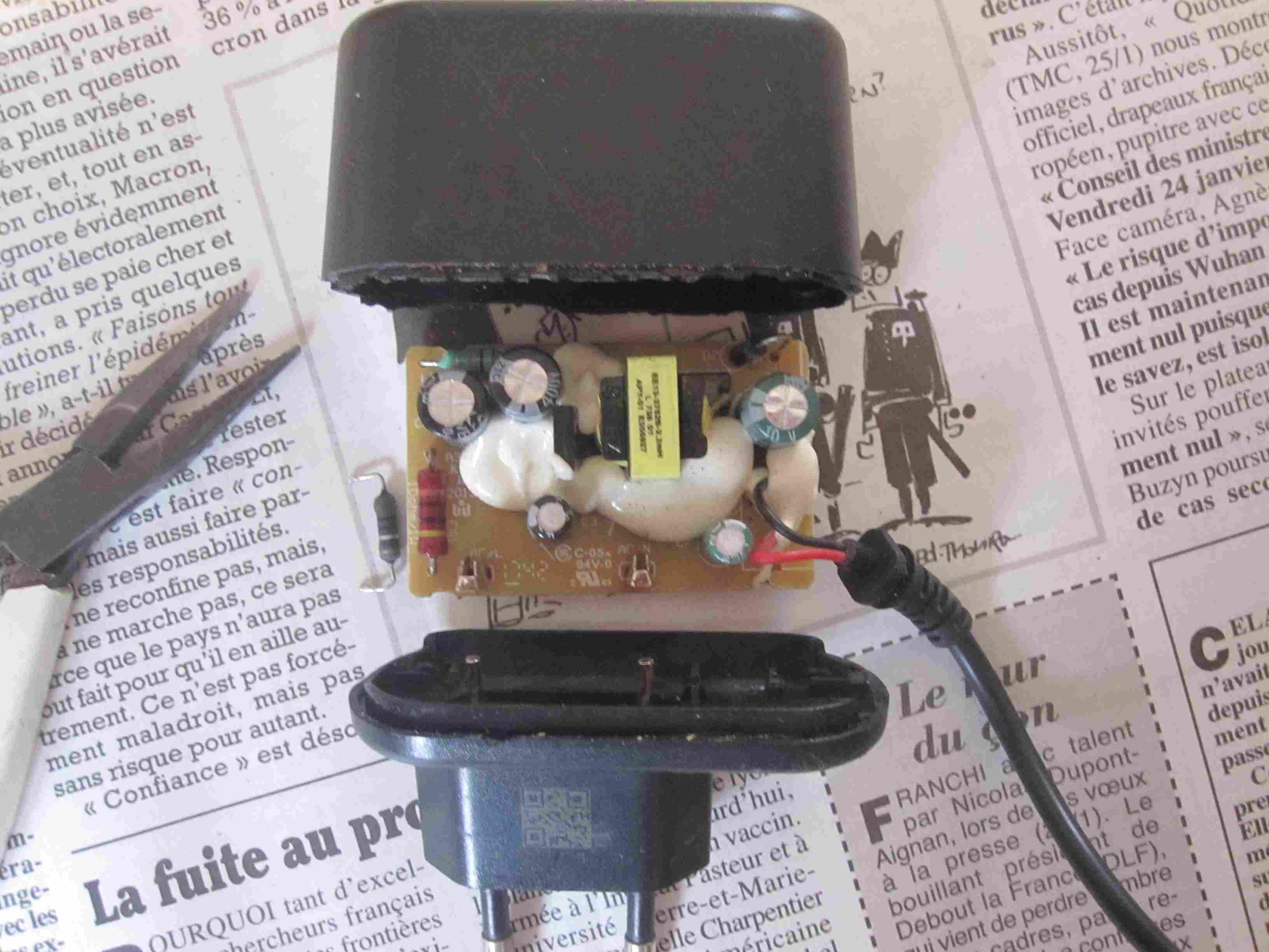 Pour le fun je l'ouvre et la panne est très vite trouvée, il s'agit de la résistance de limitation de courant qui est coupée.