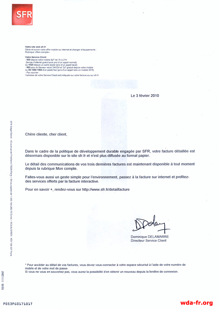 Voici un courrier reçu ce matin, accompagnant ma facture de Février 2010 : Voici donc ma dernière (a priori donc) facture papier : Hé oui... 108 pages... Pour 42,40 euros... avec Internet VRAIMENT illimité, les textos et MMS aussi, 2 Hrs de communication par mois et 3 numéros gratuits... Je comprends qu'ils ne veuillent plus m'envoyer ça par la poste...