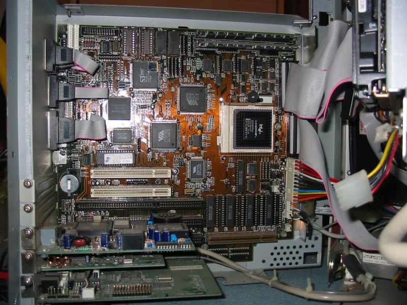 La bonne nouvelle c'est qu'il a enfin démarré et après une reconnaissance du disque dur introuvable dans un bios Award, il a finalement booté sur un w95 anglais. pas d'option de boot sur cd donc je ne ferais pas un rapport complet, il se fait tard et graver everest pour l'installer me motive que moyennement. En tout cas il s'agit d'un 486dx20 66 Mhz socket 3 avec 2X4Mo de ram edo. La video S3 ne m'explique pas la triple sortie ecran de tout façon pas géré par w95. Pareil, les test techniques de video ce sera pour un autre jour. Voiçi quand même les photos.