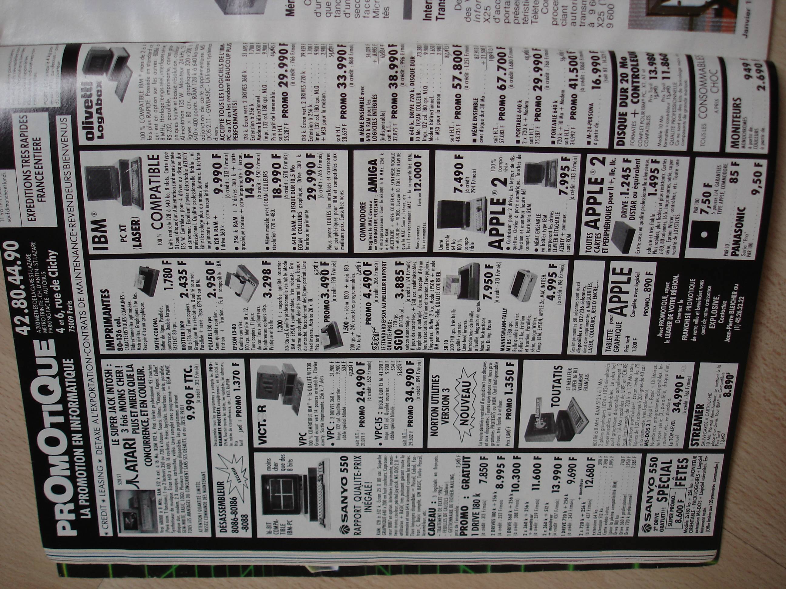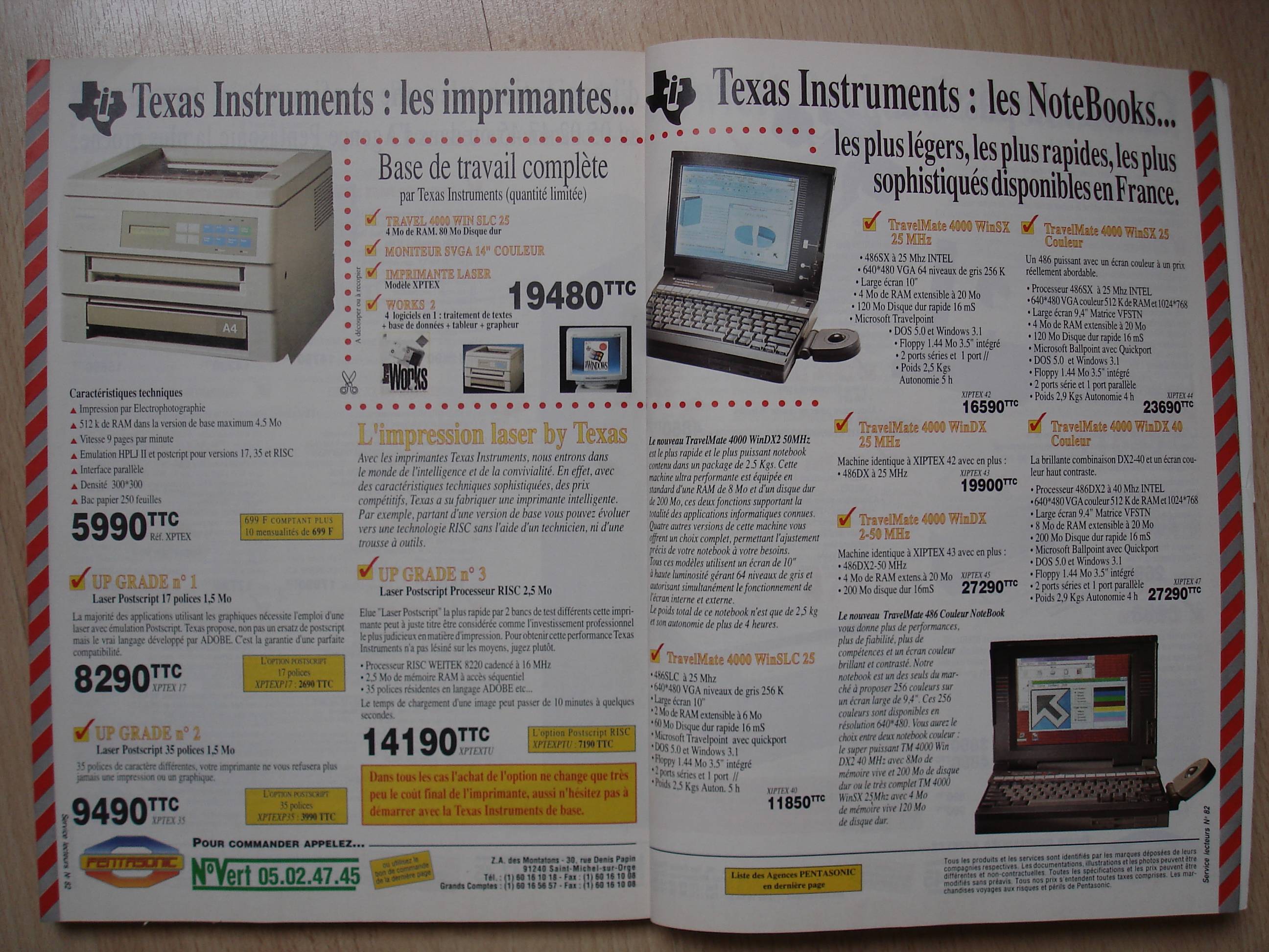 La face avant. L'arrière, la prise péritel permet le raccordement d'un téléviseur SECAM, en effet la M82 ne sort que du PAL sur sa sortie vidéo. L'intérieur, le boitier marron foncé en haut à gauche est le convertisseur PAL/SECAM. Dans un autre registre, un canon X07 accompagné de son imprimante couleur. Toshiba 4400SXC, 4 Mo de Ram 486sx25 remplacé par un 486 DX2-50, disque de 120 Mo et un bel écran en matrice active.