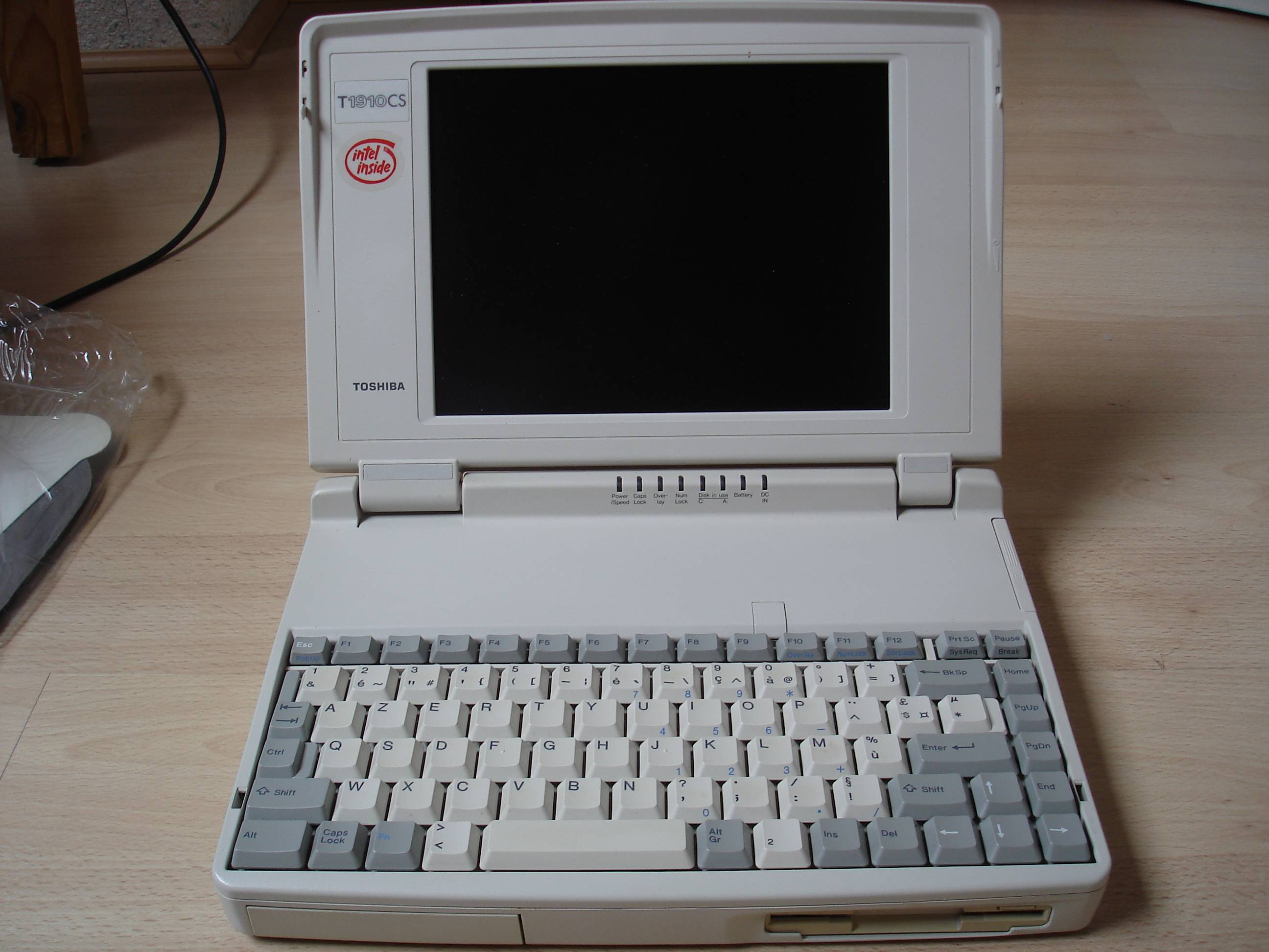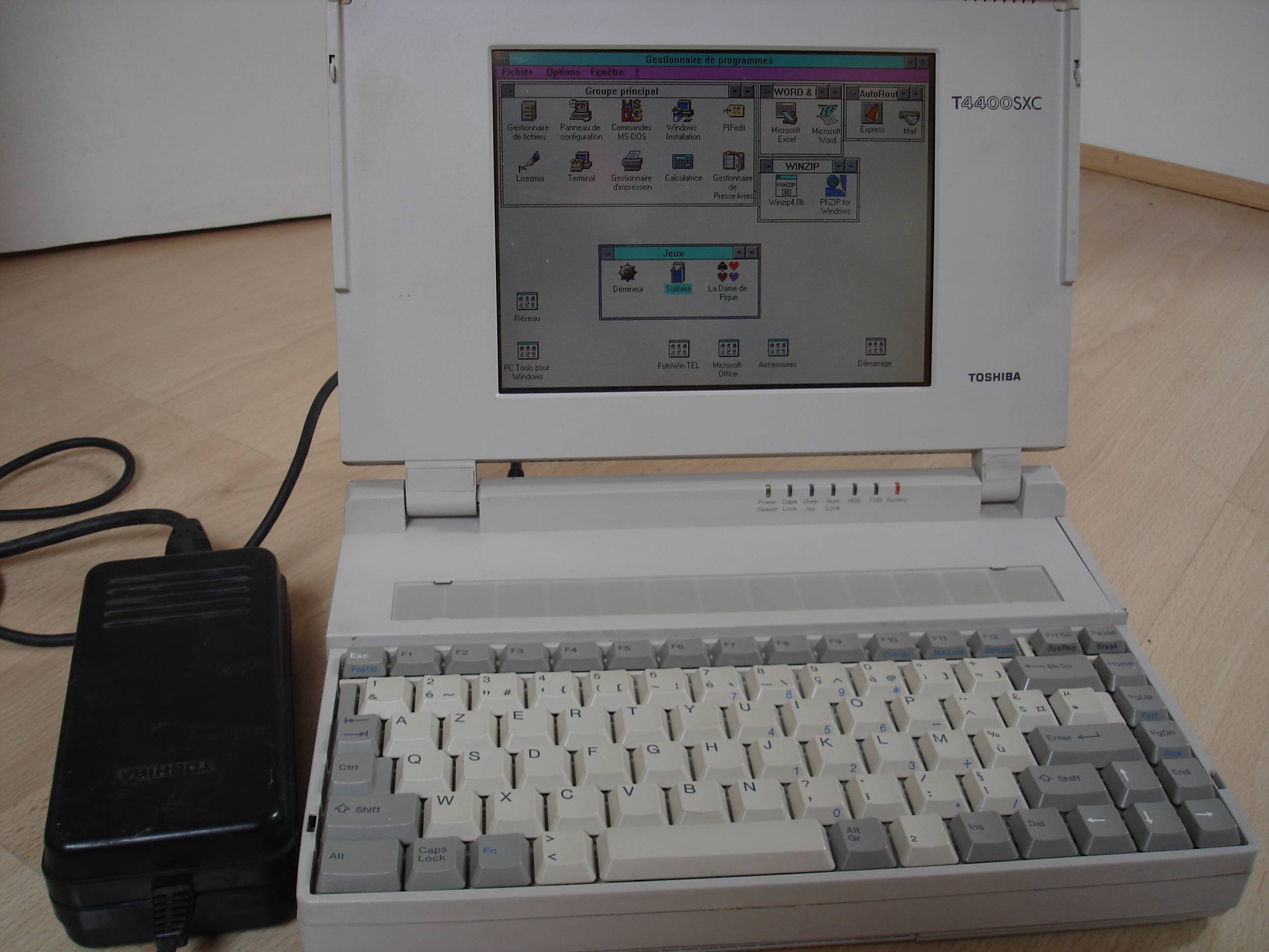 Pour la petite histoire, celui-ci est tombé d'une armoire, le processeur avait sauté de son support ZIF et une nappe écran s'était décollée, un angle de la machine est éclaté et il y a quelques fêlures dans la coque mais la bécane fonctionne bien après des soins intensifs ! Toshiba 1910 CS, 8 Mo de Ram 486SX33 et un disque de 1.2 Go qui fonctionne avec un boot manager spécifique car la machine n'accepte pas de disque supérieur à 500Mo le tout sous Windows 95. L'écran, 640X480, est une matrice passive vraiment pas terrible
