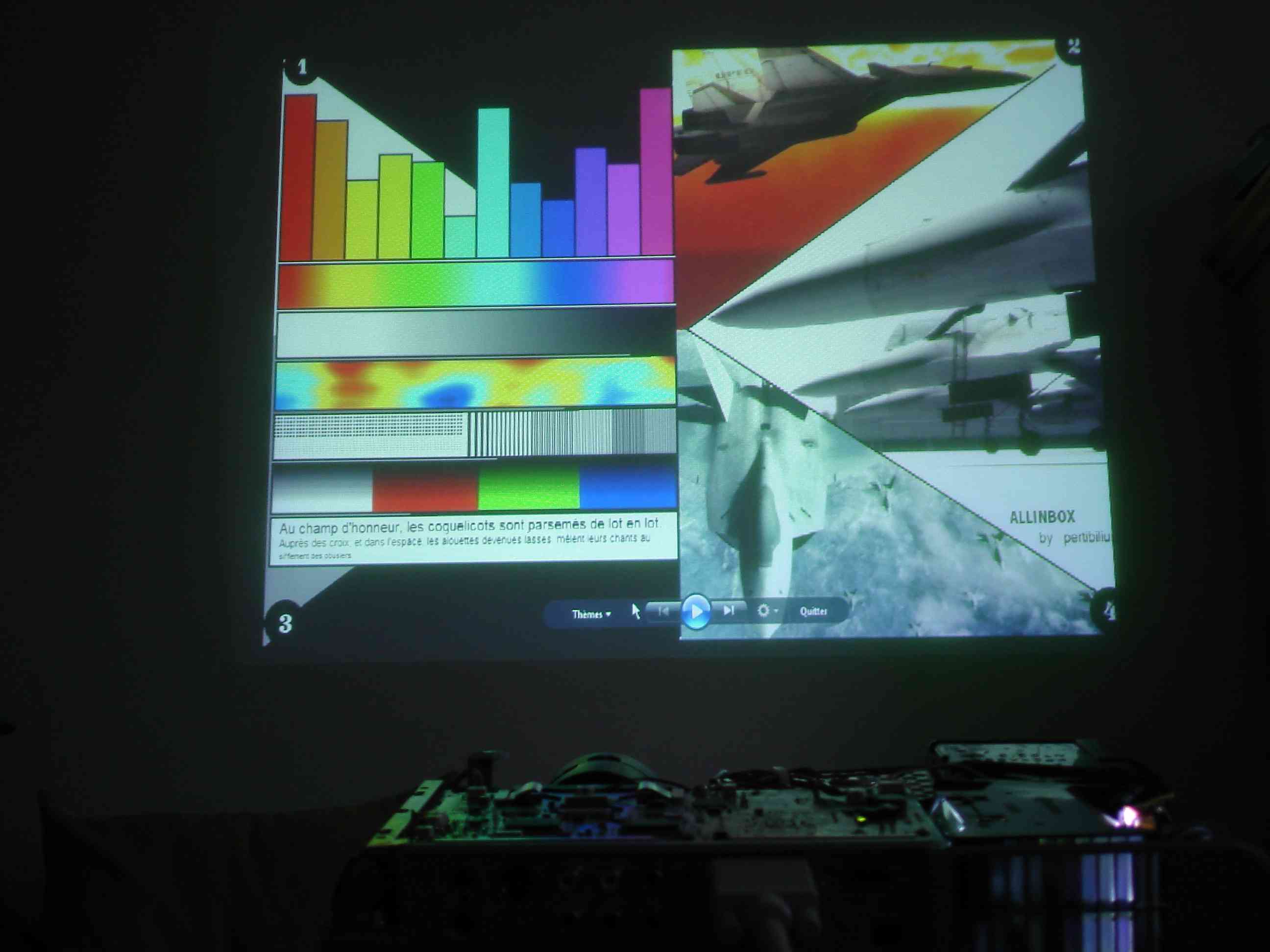 En shuntant la détection de fonctionnement de la lampe et en installant un halogène de 50 w à la place il démarre immédiatement, la roue chromatique se stabilise (c'est un DLP), les ventilateurs fonctionnent et bien sûr affiche ce qui est présent sur l'entrée vidéo, en l'occurrence un pc en 1152 X 864.