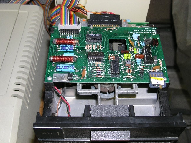 Je me suis beaucoup baladé ces jours ci sur des sites parlant des DISK][ et j'ai vu cette carte qui semble faire partie des premiers modèles reconnaissables aux selfs en longueur ainsi que la nappe multicolore, les nappes blindées n'étant apparues que plus tard à cause de problème de rayonnement. normalement c'est le signe d'une mécanique SHUGART, les miens sont des ALPS.
