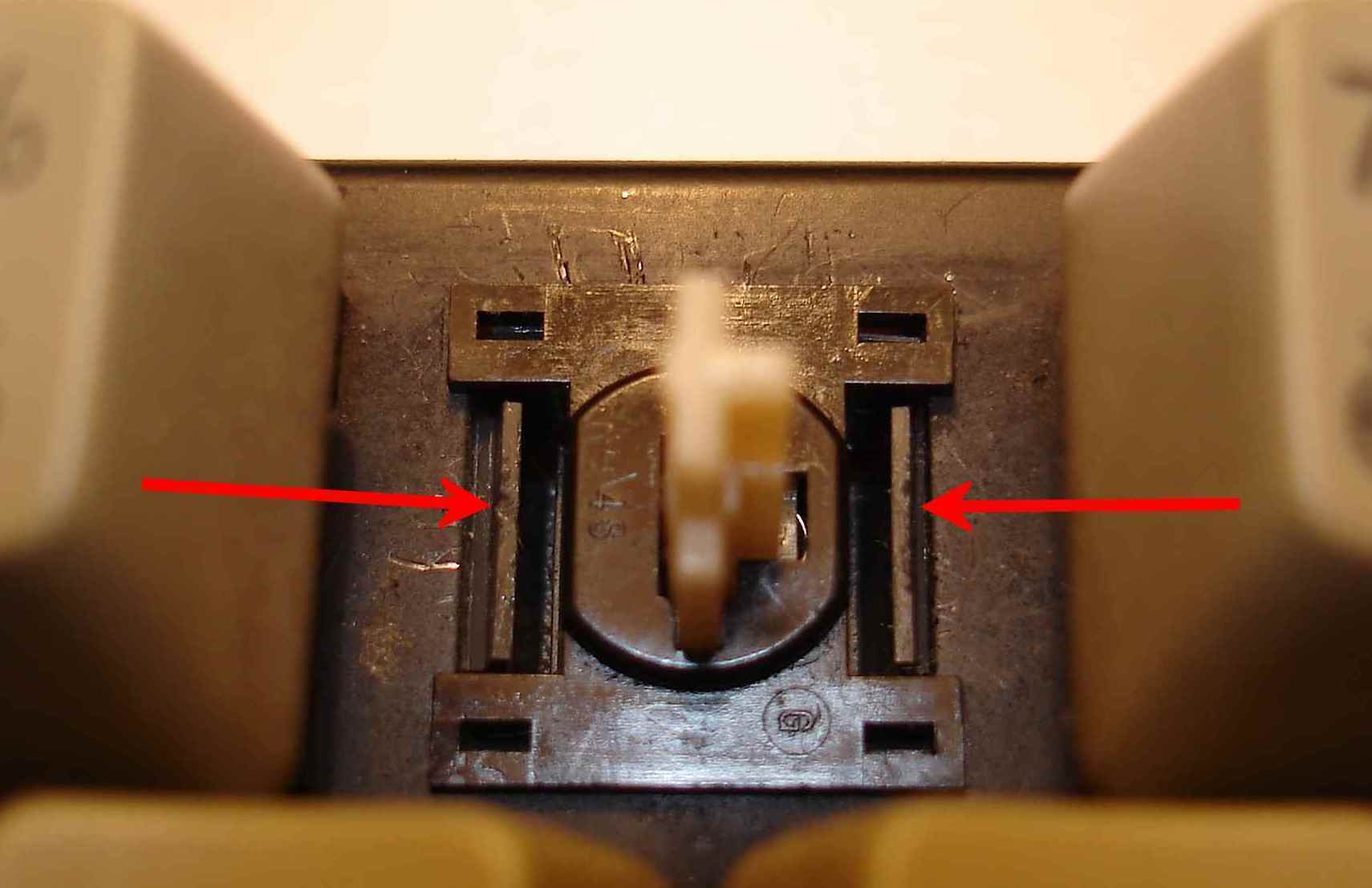Pour retirer la touche du capot métallique, il suffit de presser à l'aide d'une pince plate ou d'une pince brucelle les 2 petits inserts de blocage vers le centre de la touche comme indiqué sur la photo et en même temps de tirer doucement sur la touche. La touche est composée de 2 parties qui sont clipsées ensembles et maintenues par des petits