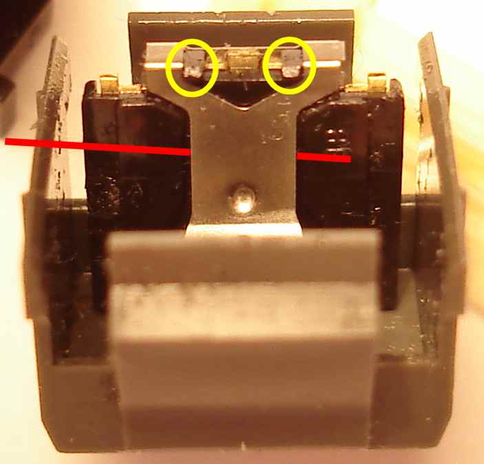La seule précaution à prendre est de dégager doucement les 2 parties pour ne pas perdre le petit ressort à l'intérieur du switch. Maintenant le mécanisme est bien visible et se compose d'une petite palette qui est clipsée sur la partie du contact électrique. Insérez une aiguille (trait rouge) sous la palette et tirez vers le haut pour la dégager des 2 petits blocages (cercles jaunes sur la photo). Tordre légèrement les 2 fourches de la palette (en haut avant, en bas après).