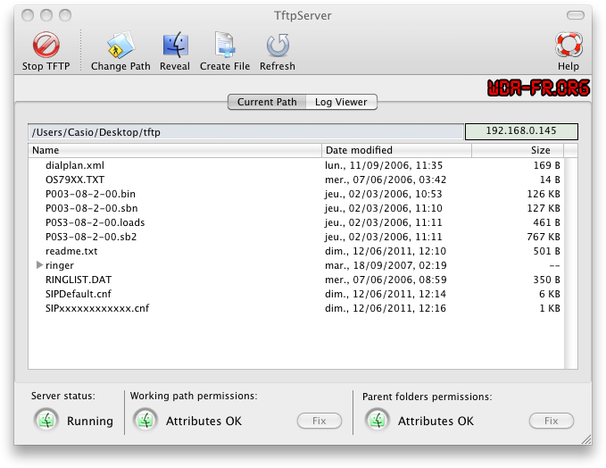 Sur Mac, un serveur TFTP existe en natif mais en ligne de commandes (une version GUI existe mais ne semble pas fonctionner dans ce cas CISCO), je me suis alors rabattu sur TftpServer (Version 3.3.2) qui marche à merveille.