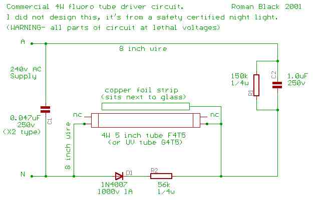 La simplicité du schéma ne doit pas faire oublier que tous les éléments sont reliés au secteur et en particulier la bande de cuivre ou d'aluminium (copper foil strip) qui doit toucher le tube pour permettre son amorçage.