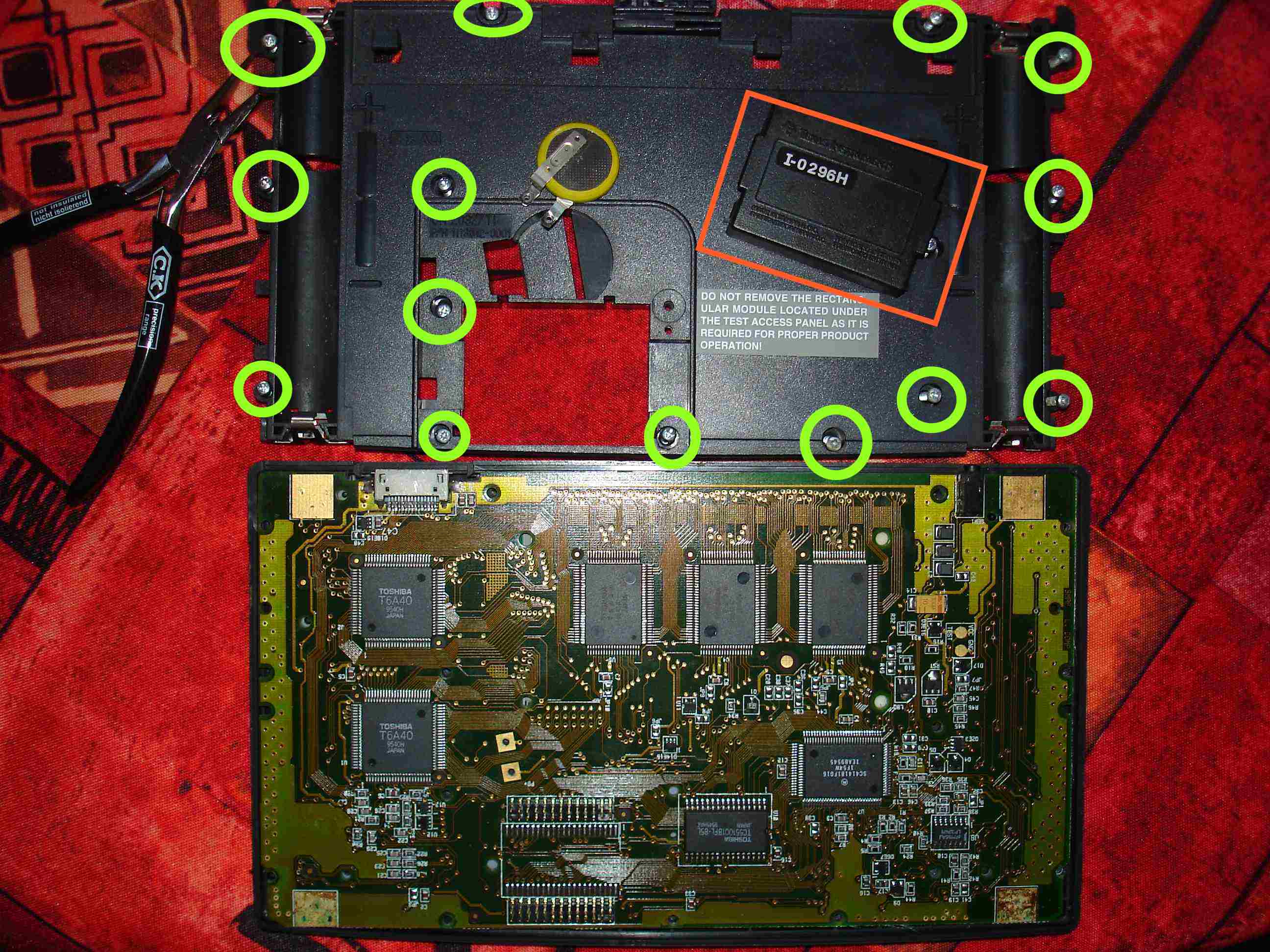 Il faut avant tout enlever la trappe de la pile de sauvegarde et enlever le module mémoire (entouré en rouge) qui se trouve dessous et ne pas oublier de dévisser les connexions de la pile de sauvegarde.
