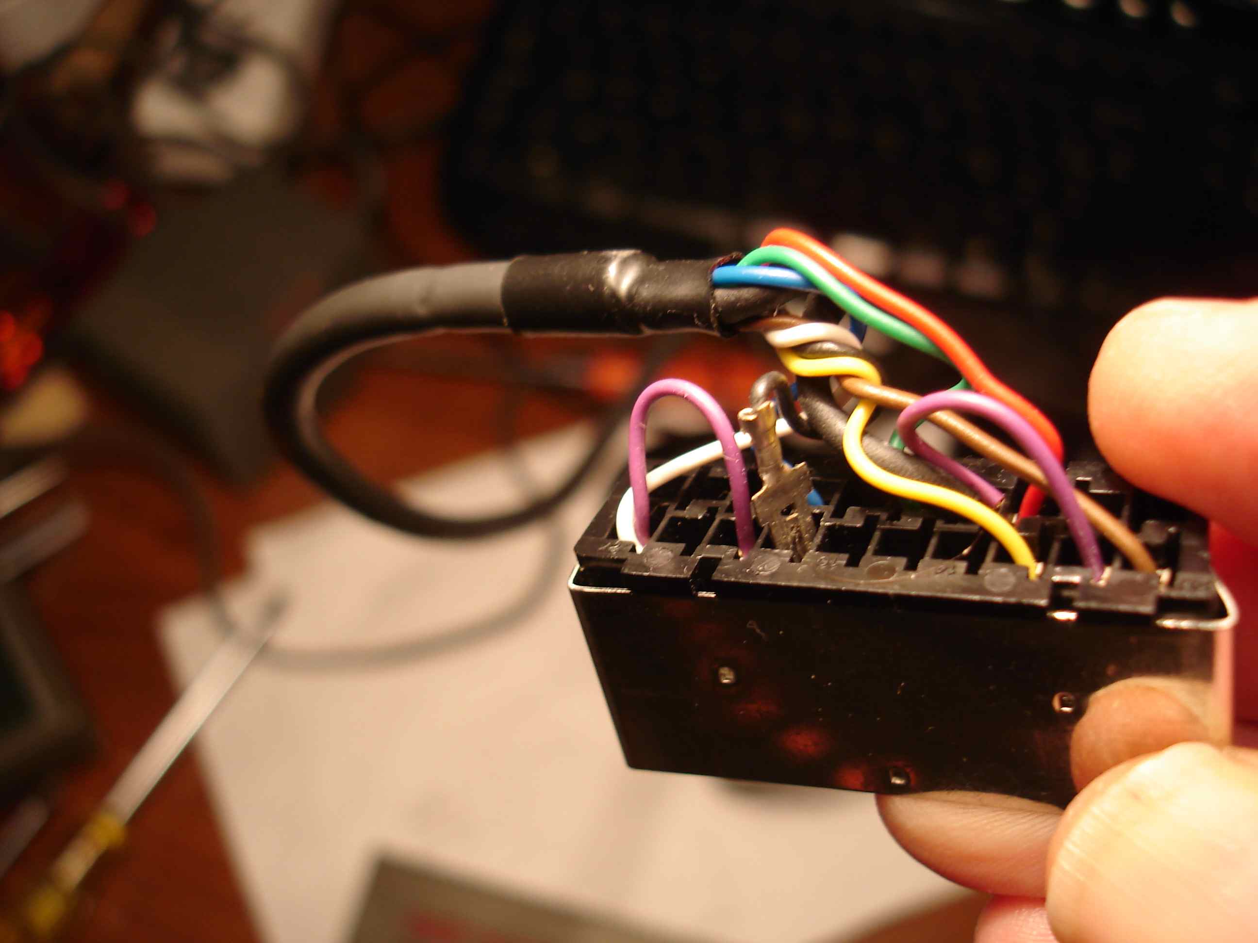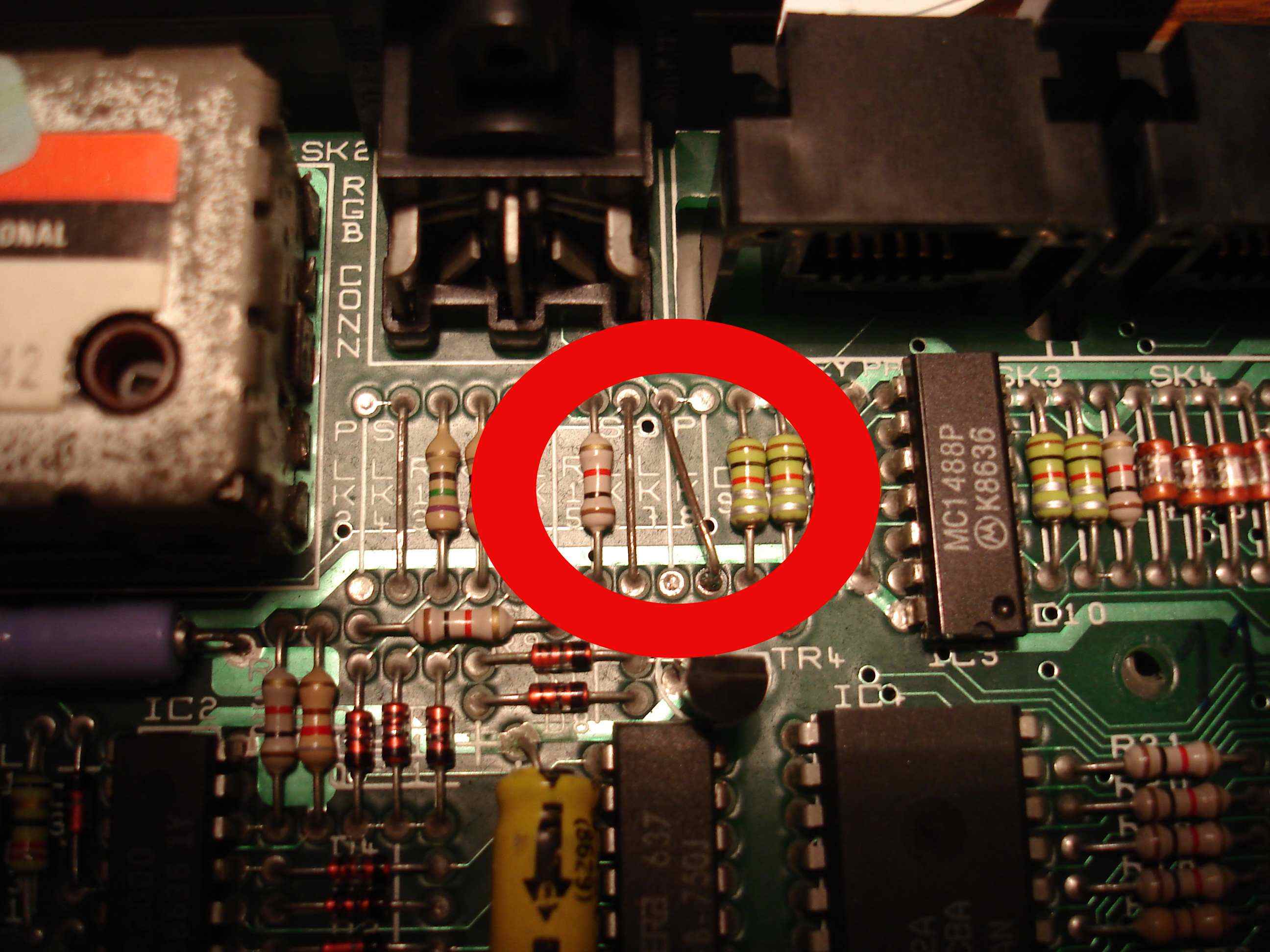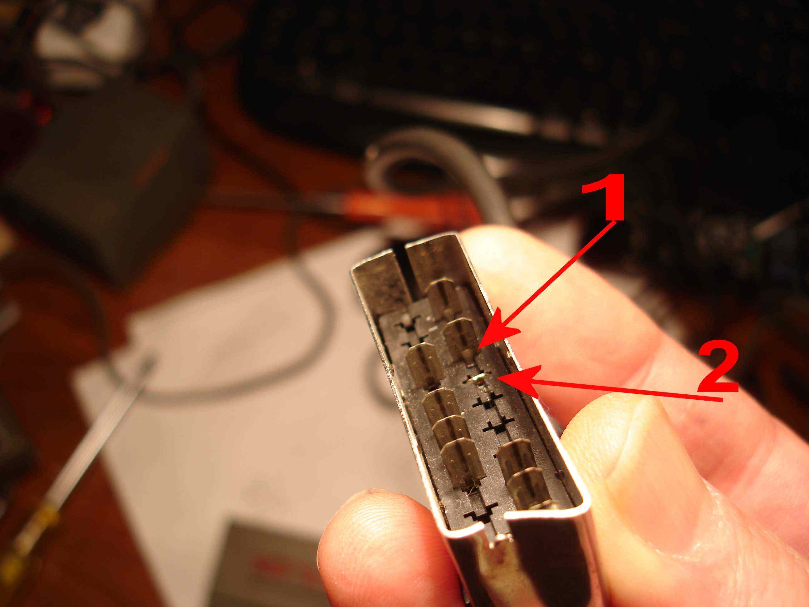 Et oui c'est bien une carte mère Amstrad, sur la partie gauche on voit le modulateur UHF et sur la partie droite le régulateur 5V monté sur un gros radiateur. Pour cabler le son c'est simple, il suffit de déplacer le strap ! Pour résoudre le souci avec la largeur d'image, plutôt que d'effectuer des modifications sur la carte mère, j'ai préféré tout simplement retiré la broche 8 de son emplacement. Pourquoi ? Eh bien parce que n'ayant pas de moniteur AMSTRAD couleur d'origine je ne sais pas si celui ci a besoin de cette tension ou non, il est beaucoup plus simple de remettre la pin 8 en place en cas de besoin que d'aller remodifier la carte mère ! Pour enlever une patte d'une prise péritel sans tout casser il suffit d'appuyer sur la petite patte de blocage au bout de la flèche 1. En 2 on voit la patte 8 qui est simplement repoussée dans la prise. Ouf !! j'ai réussi à ne pas violer l'étiquette de garantie