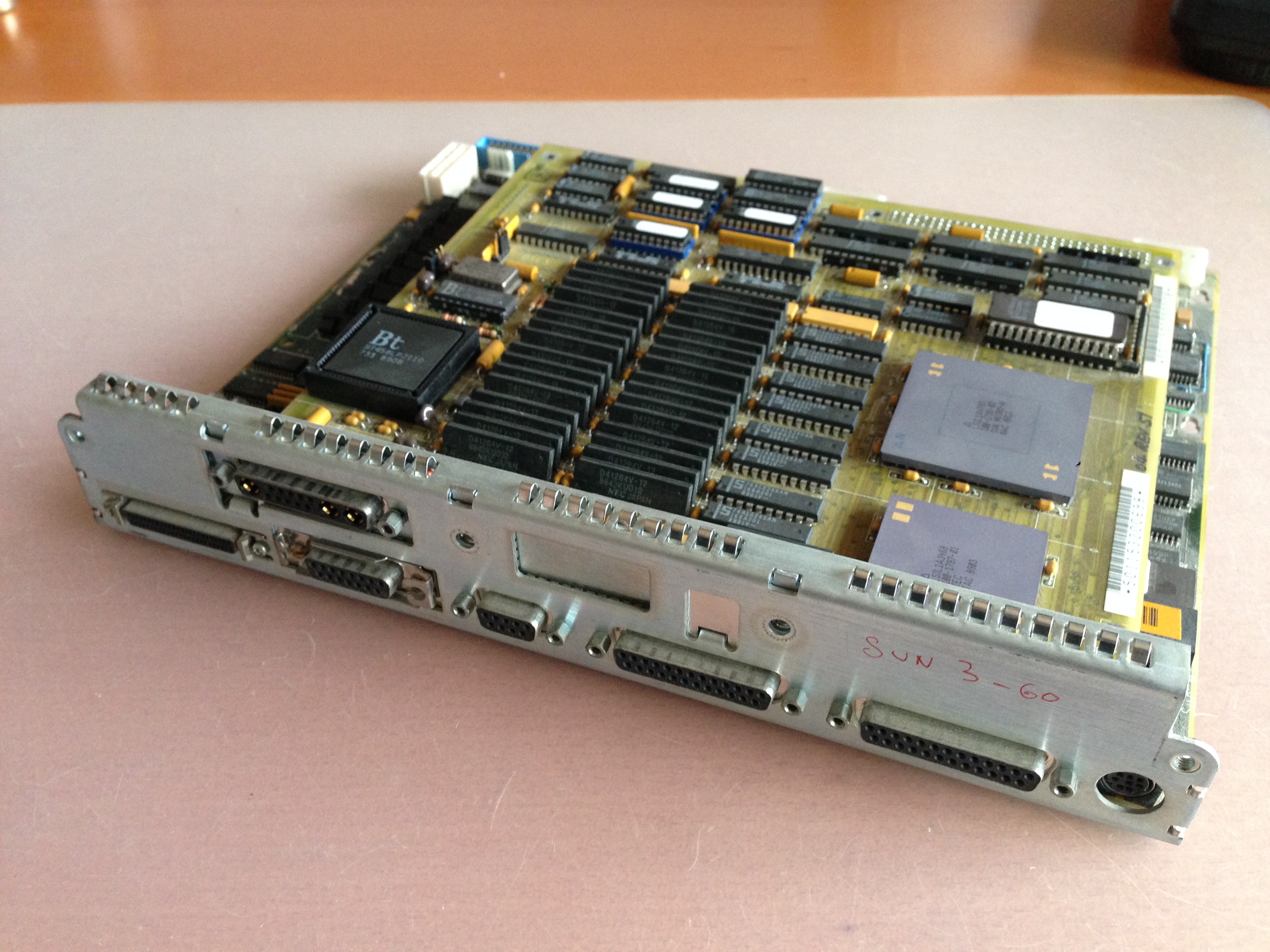 Les Sun 3 étaient la lignée de stations Sun à base de processeurs 68000. Celle-ci était la plus rapide des stations « pizzabox », avec son 68020 à 20 MHz et son coprocesseur math 68882 également à 20 MHz, qu’on voit sur les photos plus bas.
