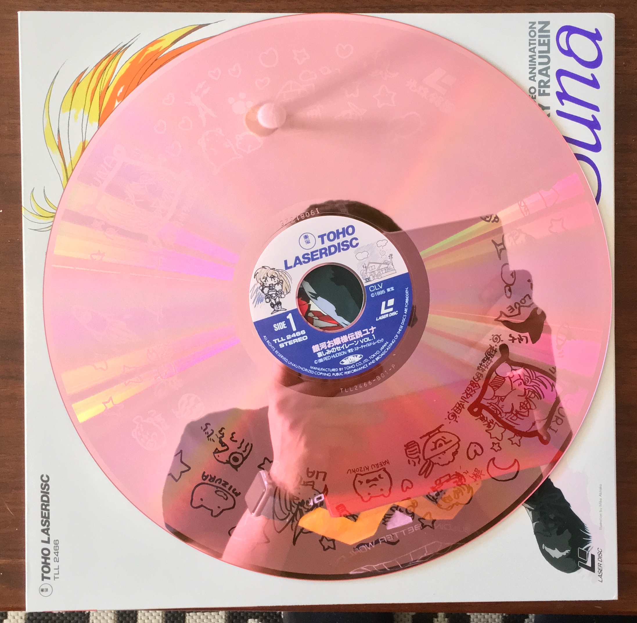 J’ai trouvé un LaserDisc pour vous montrer (et la collection) mais c’est assez compliqué à montrer. En effet, le LaserDisc reste extrêmement réfléchissant et le contraste sur la face rose assez moyen. Mais c’est plutôt mignon et ça change de la tortue de Pionneer.