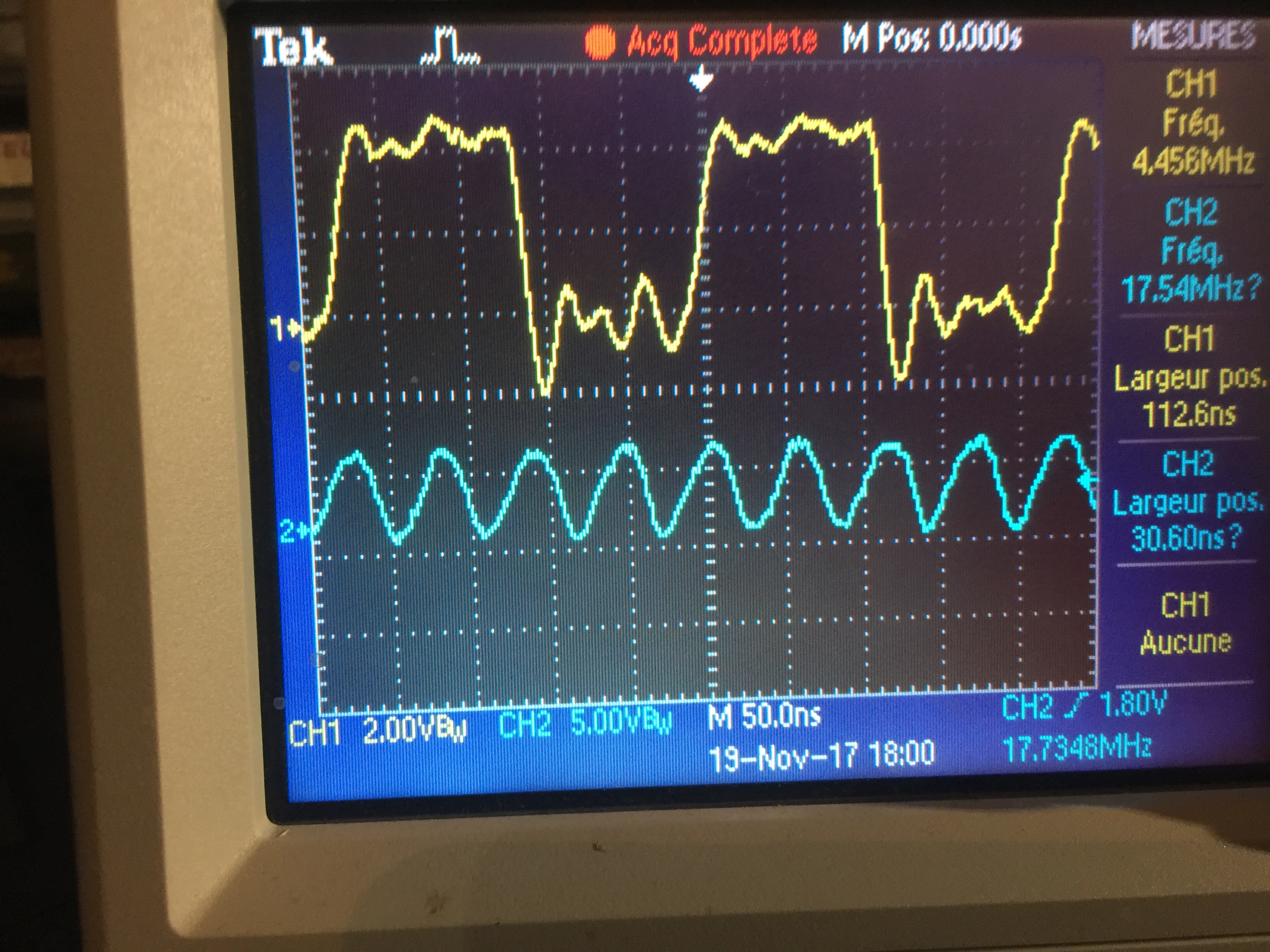 Bon, ça commence mal... Normalement sur la pin 8 du 74S86, je devrais avoir la sortie du quartz à 17Mhz, j'ai (déjà) la moitié 8.5Mhz ce que je devrais trouver sur 7M (voir plus haut, l'image "synchronisation")